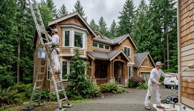 Woodinville's tree canopy is beautiful but creates specific exterior painting challenges. North and east-facing siding stays damp longer into spring and is more prone to mildew and moss. Shaded areas near large firs and cedars can see significant algae growth on paint within 3–4 years if the wrong products are used.